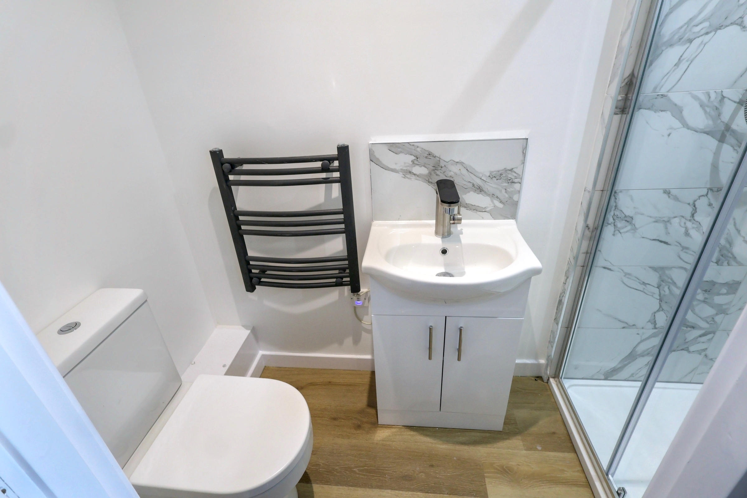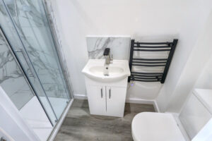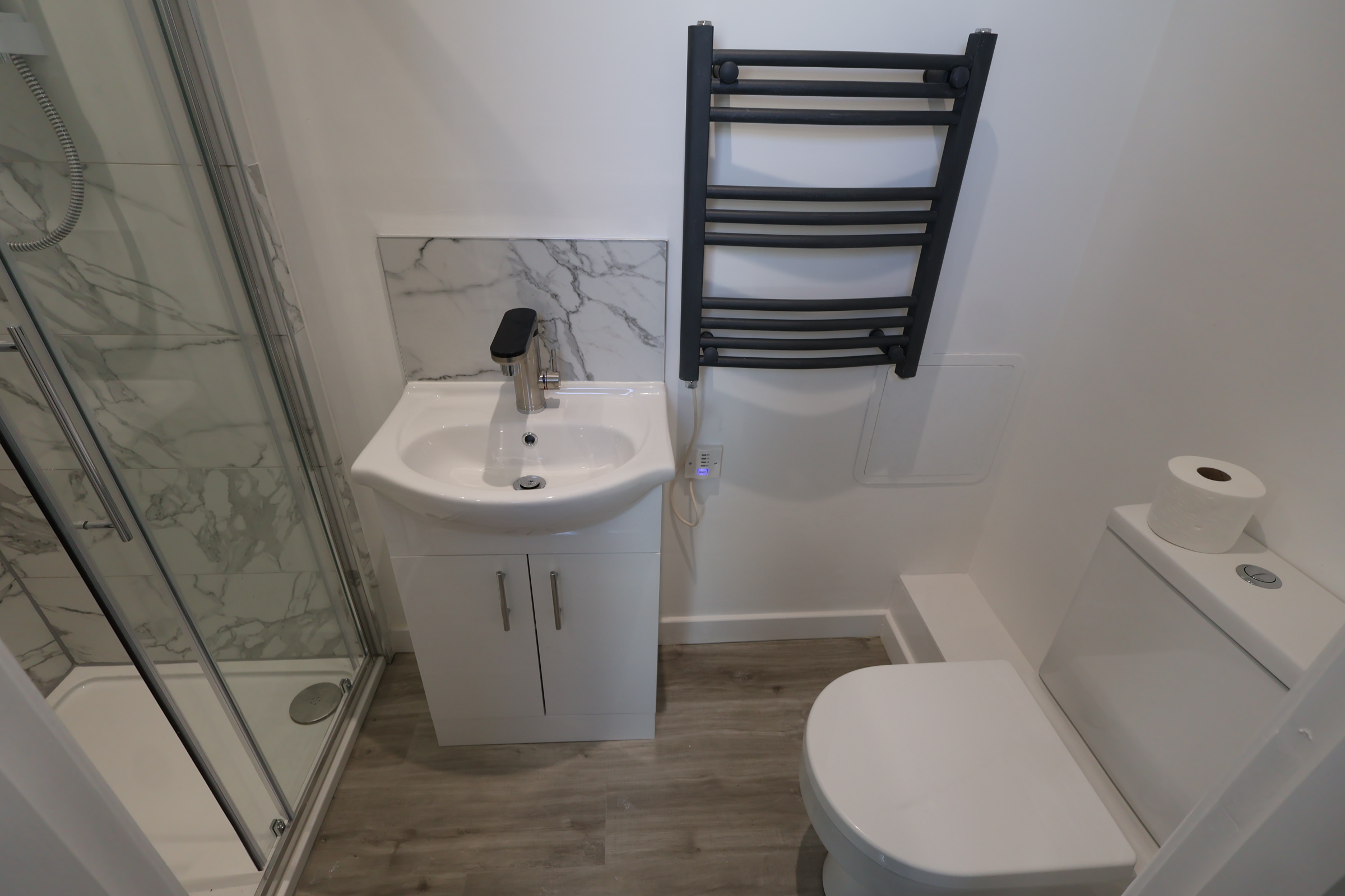 Private ensuite with shower, sink, toilet, heated towel rail, extractor fan, and vinyl flooring
